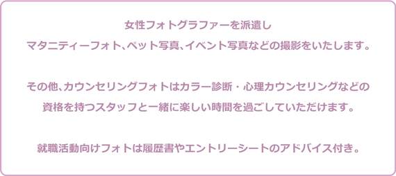 女性フォトグラファーとの楽しい時間のなかで記念の1枚を残しませんか。 |