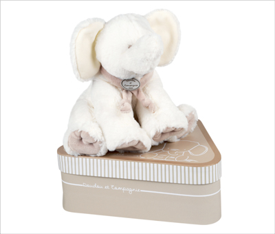 三角のボックス入りの 肌触りがとても優しいゾウのぬいぐるみです。