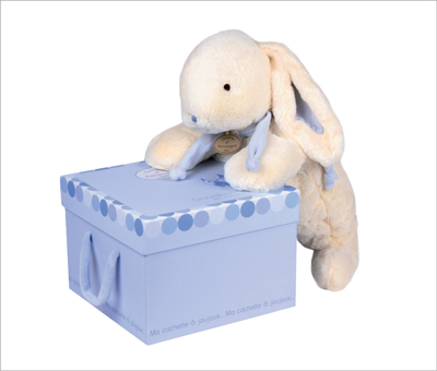 愛らしいウサギさんのお腹にはポケットがあり、お気に入りのおもちゃなどがしまえるようになっています。長い耳は赤ちゃんにも握りやすいサイズで、目は刺繍が施されているため、小さい月齢のお子さまでも安心して使用していただけます。