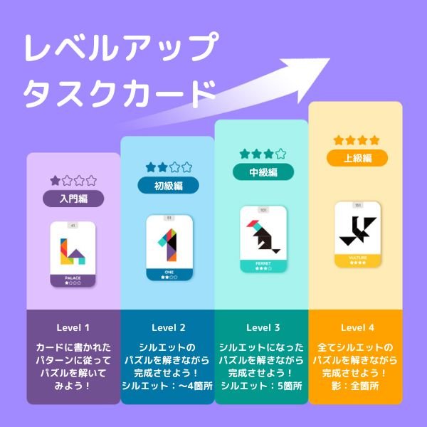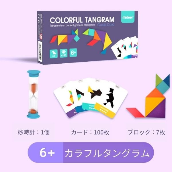 たった7枚のブロックを使って、4段階レベルのタスクカード100枚(表裏200パターン)に挑戦できるタングラム。 タイムで競えるように砂時計(3分)もセットされています。 お子さまから大人まで楽しめます。 ☆回答付き