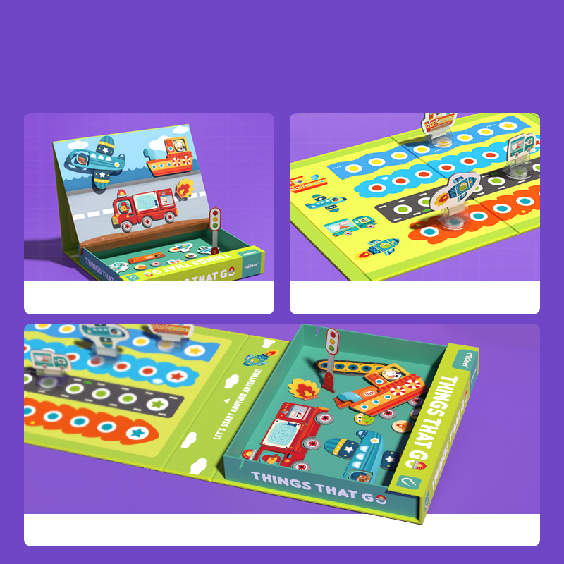 パーツを組み合わせて働く車ができあがるマグネット絵合わせパズル。ボックスの台座に、ピタッとパーツを貼り付けて楽しみます。マグネット式のパーツなので自分好みにアレンジしても楽しめます。台座は収納ボックスになっているので、お片付けの練習にもなります。