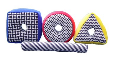 白黒の幾何学模様と原色のハイコントラストの布製おもちゃ。